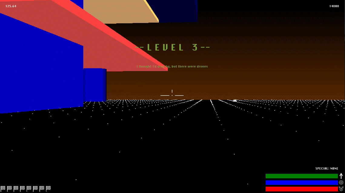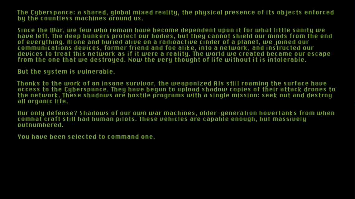 The physical world is ruined, and virtual reality is the only reality worth the name. Now the networked world-- the Cyberspance-- is under attack from the machines we once created to fight one another. Conceived as as 90s-style tank game, with inspiration from Hover! for